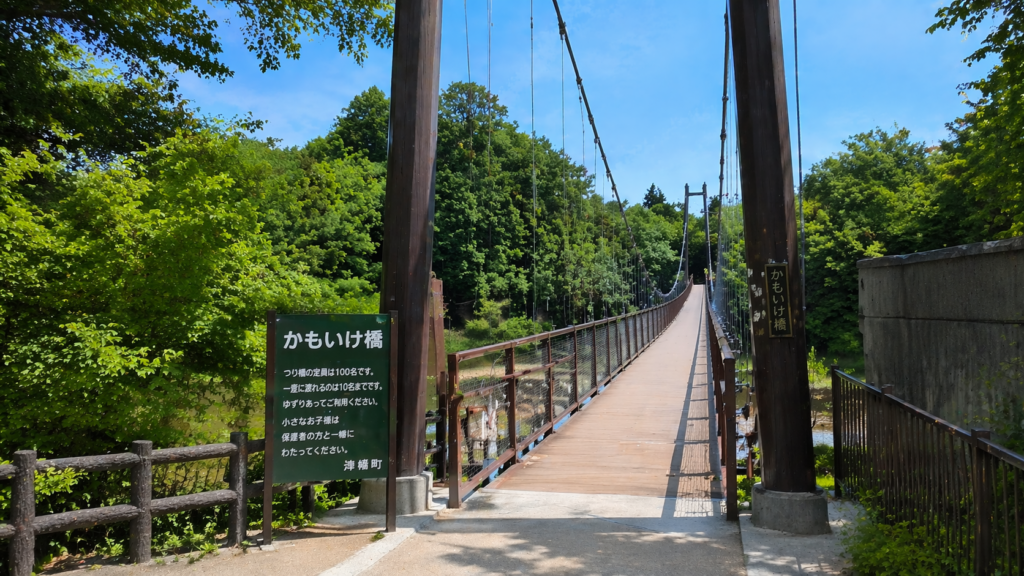 まず注目したいのが、修繕されたつり橋「かもいけ橋」です。